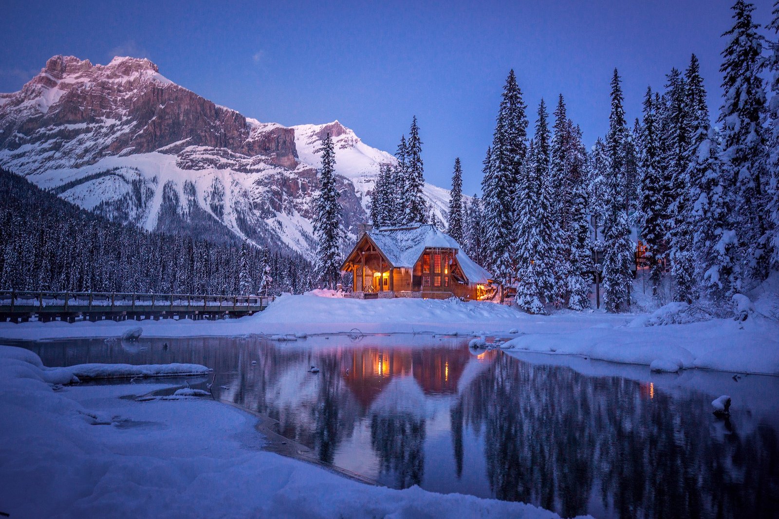 Most tourists get stuck in Lake Louise, but you have a private car. We drive you 20 minutes west across the border into British Columbia to Emerald Lake. In winter, the silence here is absolute. The snow piles high on the cabin roofs, looking like a scene from Narnia.
